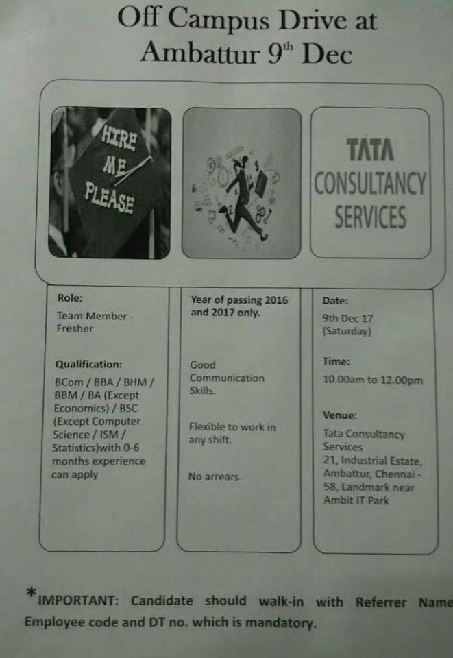 TCS - Off campus drive at Ambattur 9 Dec. 2017